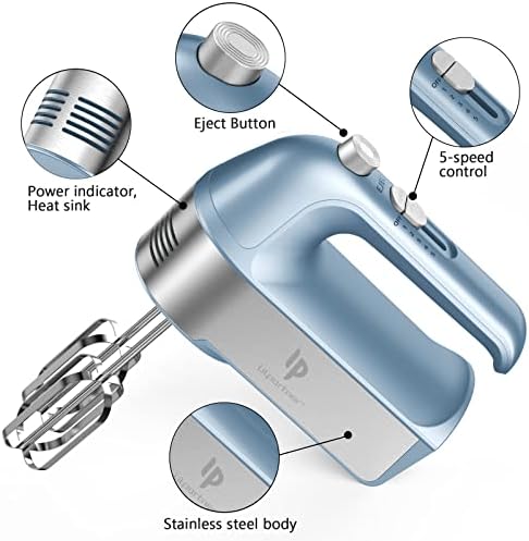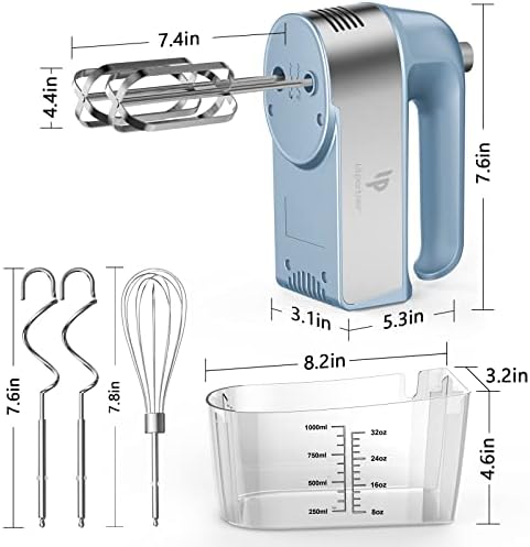 ❤SCALE CUP STORAGE CASE : When you're using the Hand Mixer, Water and Flour can be holded in the box As scale cup . Parts can be placed in the box when you finish the using.All of the attachments store neatly in a storage base for not to lose in the kitchen ❤5 VARIABLE SPEED SETTINGS AND EXTRA TURBO BUTTON : With a 450W motors and 5 different Speeds to help you whisk, mix and knead and the turbo of the hand mixer can help you more efficient and quick ❤ONE BUTTON EJECT DESIGN AND FIX STAINLESS STEEL BEATERS : Convenient and Safe to dismantle or clean the electric hand mixer’s beaters when you want to switch the different beaters. Conveniently operate hand mixer with one hand ❤VERSATILE SAFE ATTACHMENTS : Electric hand mixer includes 5 stainless steel attachments, two dough hooks, two beaters and a whisk, perfect for cooking or baking. ❤AFTER-SALES SERVICE : 24-hour customer service online, 365 days free replacement for product problems