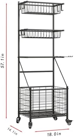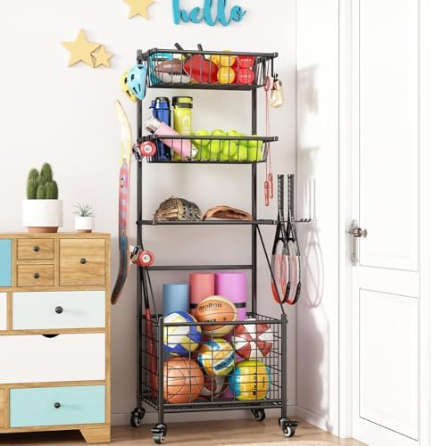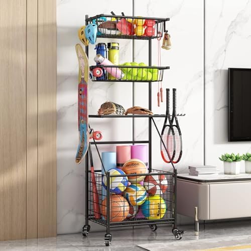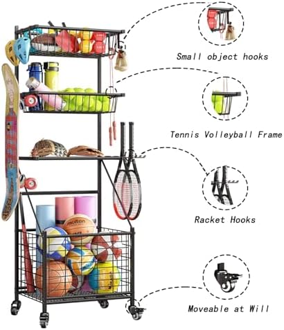 MULTIFUNCTIONAL SPORTS EQUIPMENT ORGANIZER: This rolling organizer has 4 mesh tiers, perfect for organizing baseballs, gloves, basketballs, jackets and other sports equipment. With the removable storage hooks, you can store baseball caps, helmets, bats and more on one organizer. DURABLE and LONG-LASTING ROLLING CART: Sports ball storage rolling cart is made of heavy-duty powder-coated steel that resists chipping, peeling and rusting to ensure a long life. The steel rod in the center makes the organizer more stable and reduces the risk of wobbling. SUITABLE for MULTIPLE OCCASIONS: Assembled rolling organizer cart measures 17.6“ long x 13” wide x 59.4” high. Measure where you want to place it and make sure the ball cage fits in your garage. This sports storage rack can help you organize your kids' sports equipment and keep your room clean and tidy. Ideal for garages, homes, storage rooms, game rooms, gyms, basements and utility rooms EASY to ASSEMBLE: This Storage Organizer Comes with Detailed Instructions,Making Installation a Breeze.with the Help of the Instruction Manual Included in the Checklist, You Will Enjoy the Ease of Installing Your Entire Garage Sports Organizer. CUSTOMER SERVICE: If there is any question with our product or service, please feel free to contact us. We are always here to provide professional solution for you.
