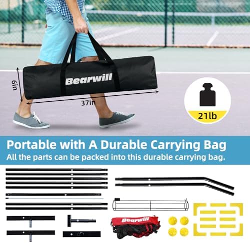 Triple-layered Polyester Net Masterfully Designed by Pickleball Net Specialists USA Regulation Size for Authentic Play - Our pickleball net system regulation size is 22 ft wide, 36” high at the side posts, and 34” high at the center, which meets with official pickleball guidelines. With everything you need (1 pickleball net, 12 court markers, 4 pickle balls, 1 ball holder & 1 carrying bag), you can enjoy a true pickleball experience, whether you're practicing for tournaments or engaging in friendly matches with friends and family. Durable Support for Powerful Play - Don't settle for flimsy nets that can't handle intense gameplay. Our pickleball net for driveway uses reinforced triple-layered polyester net, providing 2x stronger support compared to ordinary sets. The tear-resistant net captures powerful shots, while the crack-resistant metal post ensures long-lasting performance. Say goodbye to wobbly and ripping nets and elevate your game. Sturdy and Durable Metal Frame - Crafted with high-quality materials and featuring a robust 0.8mm thickness tube, this metal frame provides a solid foundation for reliable and secure gameplay. The powder-coated poles offer exceptional water resistance, ensuring long-lasting protection against rust even during extended outdoor use. Play with confidence, knowing that your outdoor pickle ball net is built to last. Convenient Portability for Any Location - Elevate your pickleball experience with our portable outdoor pickleball net. it's a total weight of 21lbs, you can easily take your pickleball games on the go and enjoy the sport wherever your adventures take you. Our pickleball bag with lightweight and compact design ensure hassle-free transportation, and the included 600D Oxford zipped carry bag provides convenient storage and portability. Effortless Assembly and Storage - Experience the convenience of setting up our portable pickleball net within minutes. Featuring an interlocking design and straightforward instructions, assembling the pickleball set with net is a breeze, taking just 5 minutes of your time. Don't let complicated setup processes hinder your enjoyment—choose our user-friendly pickle ball net for seamless assembly and convenient storage.