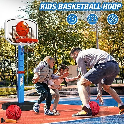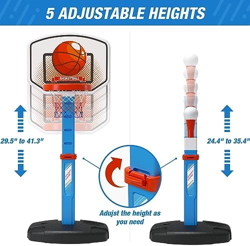 3 WAYS TO PLAY - ①Kids basketball hoop: with 2 basketballs for multi-player games. ②Kids baseball tee stand: with stretchable bat and 4 baseballs. ③Automatic pitching machine: hitting an automatically ejected baseball. 2 in 1 kids basketball hoop and tball sets provide you and your family or friends to enjoy a fun sport game and have more fun 5 ADJUSTABLE HEIGHTS - Accompanying your child's growth. The height of basketball hoop can be adjusted from 29.5in to 41.3in, while the height of baseball stand can be adjusted from 24.4in to 35.4in. You can put it low when your baby wants to dunk on it, or put it high when he wants to shoot and practice his skills STURDY DESIGN - HYES 2 in 1 kids basketball hoop & t-ball sets are made of non-toxic and durable material, safe for kids. You can add water or sand to the base, and put a sandbag or other heavy objects on the base to increase stability. It is a great indoor & outdoor toys for kids EASY TO ASSEMBLE - Our sport set includes all necessary assembly accessories. You can easily complete the assembly and play immediately! No extra tools! Having great time with this basketball and baseball toys right away IDEAL GIFTS FOR KIDS - This 2 in 1 kids basketball and baseball toy sets are perfect for toddler boys girls as a birthday, Christmas, Thanksgiving, New Year's gift. Your little one would be excited to receive this multifunction sport toys! Catch every suprise moments of your baby
