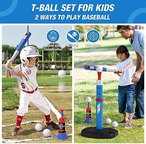 2 in 1 Toddler Basketball Hoop and T Ball Set, Kids Toys Boys 3-5, Adjustable Kids Basketball Hoop with Automatic Pitching Machine, Indoor Outdoor Sport Toys Gifts for Baby Boys Girls, Blue