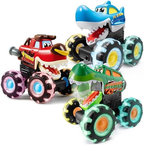 JOYIN 3 Pack Monster Truck Toy - Motion Activated Light-Up Cars for Toddlers - Monster Treads Lightning Wheels - Baby Toy Present - Press & Go Cars for Boys Girls