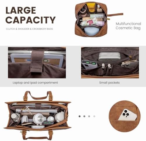 【Elegant Laptop Tote Bag & Stand Upright 】: This laptop bag for women combines vintage charm with modern fashion, making it a classic accessory that never goes out of style. Its metal feet ensure that the work bag stands upright and maintains its shape, adding to its overall sophisticated look. 【Large Capacity & Multi-Pocket Tote Bag 】:With multiple pockets and compartments, this work bag offers generous storage capacity. Organize and carry all your essential items, such as your laptop, Water bottle, notebooks, pens, and more, with ease and convenience. Size:16.5" x 7" x 12.5"(L*W*H),clutch bag 8.5" x 4.7" x 5.5"(L*W*H). 【High Quality PU & Durable】:Crafted from high-quality PU(faux leather), this computer bag is built to withstand the test of time. Its sturdy construction and reinforced stitching ensure long-lasting durability, protecting your valuable laptop and belongings. 【Versatile for Any Occasion:】:Whether you're heading to the office, or traveling, this briefcase is designed to adapt to various occasions. It can also transform into a purse, shoulder bag, or crossbody bag. An excellent choice as a gift for your mother, wife, or friends, showcasing your taste and thoughtfulness. 【Complimentary Clutch Bag & Customer Service】: As an added bonus, this messenger bag comes with a clutch bag. Use it to keep your accessories, cables, or personal items organized and easily accessible. We also pride ourselves on providing excellent customer service, ensuring your satisfaction with your purchase. #57 in