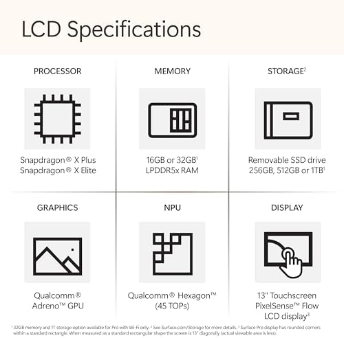 [This is a Copilot+ PC] — A new AI era begins. Experience enhanced performance and AI capabilities with Copilot+ PC, boosting productivity with security and privacy in mind. [Introducing Surface Pro 13” Touchscreen Display] — The most flexible, powerful 2-in-1 laptop and tablet with AI-accelerated Copilot+ experiences. Surface Pro 11th Edition reimagines the laptop. [Flexibility at Any Angle] — Use with the detachable Surface Pro Flex Keyboard (sold separately). Shift from tablet to laptop to sketchbook with its unique kickstand. [Outstanding Performance] — Snapdragon X Plus (10 core) or Elite (12 core) with powerful NPU, faster than MacBook Air M3[1]. [All day battery life] — 14 hours of battery life[5], fast charging with 65W PSU via Surface Connect or USB-C. [Recall with Copilot+]: Easily retrieve documents, emails, or web pages with an explorable timeline of your PC's history[2] (coming soon). [Enhance Calls with Copilot+] — Improve lighting, cancel noise, and blur distractions with Windows Studio Effects for video calls. Prerelease product shown, subject to change.