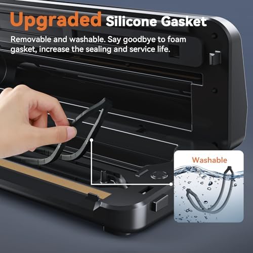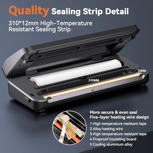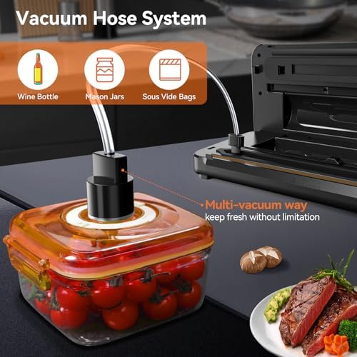 【8-in-1 for All Your Needs】One-touch vacuum sealer machine with all 8 functions at your fingertips. Dry, Moist modes allow for customized vacuum and seal for food like meats, seafood, fruits, vegetables, nuts, bread, fried potachips and beyond, extending food freshness by 10 times. Moreover, the vacuum hose accessories suitable for wine, jars, and vacuum sealer bags 【80kpa Suction Power】Pyukix vacuum sealer upgraded 80 kpa uses a DC motor pump with electromagnetics and pure copper for enhanced suction power within 10s. Sucks all air out TIGHTLY to preserve your meat and vegetables for 10 times LONGER or more to prevent oxidation and keep things fresh. Faster and seals better than others 【Bidirectional Bag Cutter & Storage】The independent vacuum bag storage makes this vacuum sealer machine easy to stock bags and avoid contamination. The bag cutter come with upgraded high carbon steel blades, cutting times up to 20,000 times. Save Your Time and Space 【12" Heating Strip and Upgraded Silicone Gasket】Pyukix 12" sealing strip supports to seal 3-5 bags at one time and seal 70+ times continuously. Upgraded silicone strip is removable and washable, and has a longer lifespan and healthier than other's foam sealing strips. Additionally, the stainless steel exterior and ABS material make it easier to wipe and clean on a daily basis 【Full Starter Kits & 2-Year Warranty】Whether pro or beginner, our vacuum sealing machine for food has you covered. Included: 1* Food Vaccum Sealer with Cutter and Storage, 1*BPA-free Roll Bags(11"*10') 5*Heat-Seal Bags (8" *12"), 6*Reusable Sous Vide Bags(8.3"*8.7"), 2*Clips, 1*Air Suction Hose, 1 x User Manual.