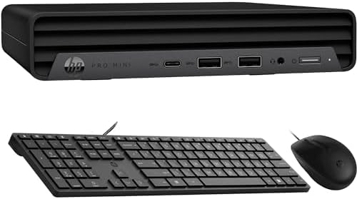 Pro Mini 400 G9 Desktop PC CPU: 12th Gen Intel Core i5-12500T (18 MB cache, 6 cores, 12 threads, 2.00 GHz to 4.40 GHz Turbo). Intel UHD Graphics 770 Memory: 16GB DDR4 RAM; Hard Drive: 512GB M.2 PCIe NVMe SSD. Optical Drive: No. Realtek RTL8852BE Wi-Fi 6 (2x2) and Bluetooth 5.2 combo. Front: 1 headphone/microphone combo; 1 SuperSpeed USB Type-A 10Gbps signaling rate; 1 SuperSpeed USB Type-A 10Gbps signaling rate (charging); 1 SuperSpeed USB Type-C 20Gbps signaling rate. Rear: 1 power connector; 1 RJ-45; 1 SuperSpeed USB Type-A 10Gbps signaling rate; 2 SuperSpeed USB Type-A 5Gbps signaling rate; 2 DisplayPort 1.4; 1 HDMI 2.1. Windows 11 Professional, English. Wired Keyboard and Mouse included. Bundled with AZ-XUT Cable.