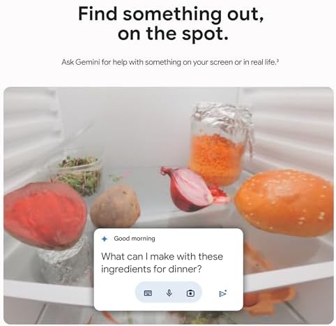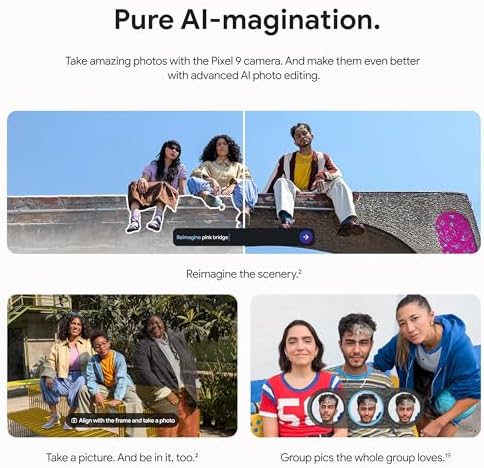 Google Pixel 9 with Gemini gets the best of Google AI first, so you can take amazing photos, make edits like magic, and get things done even easier Unlocked Android phone gives you the flexibility to change carriers and choose your own data plan[1]; it works with Google Fi, Verizon, T-Mobile, AT&T, and other major carriers The award-winning Pixel Camera includes a 50 MP main sensor for incredible image and video quality, and a new 48 MP ultrawide camera for stunning Macro Focus Make your photos better than you can imagine with Google AI; take a picture and be in it too with Add Me[2]; Best Take helps everyone look their best; and with Magic Editor, you can reframe photos, reimagine the scenery, and more[2] Get more info quickly with Gemini, your built-in AI assistant[3]; instead of typing, use Gemini Live; it follows along even if you change the topic or switch the question[30]; and Pixel Screenshots helps you save things you’ll want to remember later