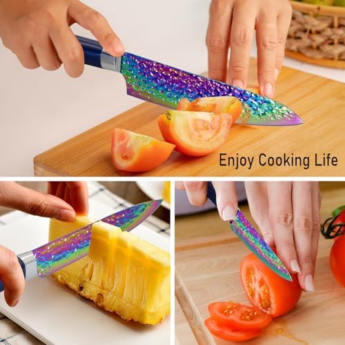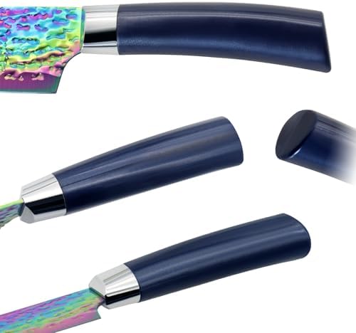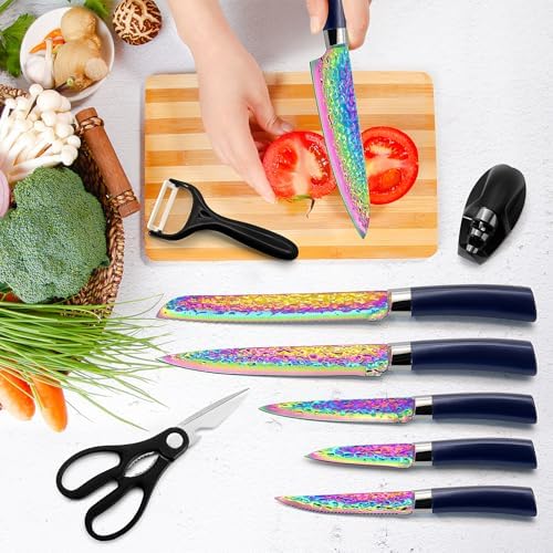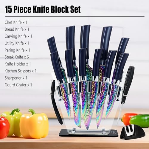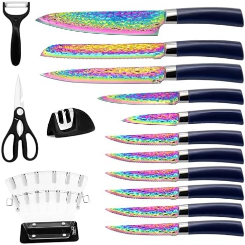 A Knife Set for Your Cutting Needs - - This 15 Pieces knife set includes 1x 8" Chef Knife 1x 8" Carving Knife 1x 8" Bread Knife 1x 3.5" Paring Knife 1x 5" Utility Knife 1x Sharperer 1x Kitchen Shears 6x Steak Knives 1x Peeler 1x Acrylic Knife Stand. All the cooking knives you need in one pack. High-Quality Material to Cutting Items - - This stainless steel knife is made of stainless steel, doesn’t contain any heavy metals and chemical elements. It will not react chemically with food, leave residue or emit an odor when used, allowing food to retain its original flavor and freshness for longer. Non Stick Forging & Hammering Texture and Thick Knife Blade Design - - Unique Forging & Hammering Texture Knife Blade makes this knife nonstick,and easy to maintain. Our tough stainless steel knives are not only sharp, also lightweight, comfortable to hold, and easy to grip. Easily cut anything (such as meat, bread, fruits, and vegetables) and let you enjoy the fun of cooking. Colors Optional and Modern Acrylic Decor & Ideal Gift - Our knife set will come with a acrylic stand that is beautiful and space-saving. Makes it easy for you to pick up the knife you need. Colors for you, Perfectly adapted to all kinds of kitchen styles. Also can be a great gift option for family and friends on birthdays, weddings, anniversaries, housewarming days, etc. Easy To Clean - - After using the kitchen knife set, simply rinse quickly and wipe with a kitchen towel, (Take care when cleaning to prevent cutting fingers). It’s an essential and practical kitchen cutting tools, by the way if became dull after using for many times you can sharp it with a sharping.