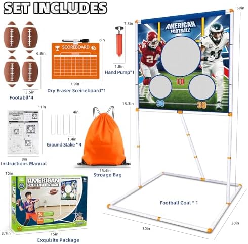 【 Inflate and Score 】 Our football game set comes with everything needed for a fun-filled game. With four inflatable rugby balls and a football throwing target, kids can practice their throws and aim for the high score. The easy-to-assemble stand and secure tying ropes ensure the mat is ready for action in no time. 【 Target Practice with a Twist 】 This football game toy challenges kids to toss the footballs at the target mat, featuring three scoring holes for added excitement. Each successful throw earns points, which can be tracked on the included scoreboard, making every play count towards victory. 【 Easy Storage, Big Fun 】 When the football game is over, simply deflate the balls, detach the mat, and stow everything in the convenient storage bag. This compact solution keeps all pieces together, minimizes storage space, and prevents loss of components. 【 Develop Skills, Build Bonds 】 This football toy is more than just a game, it's a tool for developing physical fitness and sportsmanship. It encourages kids to step away from screens and engage in active play, while also fostering interaction and bonding between parents and children during playtime. 【 The Perfect Football Gift 】 Ideal gifts for 3 year old boys girls and up, this football gift is a great gift for birthdays, holidays, or just for fun. It's perfect for outdoor game, indoor entertainment, and can be a hit at parties or family gatherings, making it a gift that keeps on giving. This football toy is designed to bring the excitement of the sport into your child's playtime, promoting active engagement and quality family time.