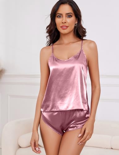 Silk Pajamas:Pajama sets for women 2 piece sleepwear,made of silky and satin fabric,ultra-soft and cozy pj set Pj Tops:The satin pajamas for women features sexy v-neck,sleeveless,adjustable shoulder straps,back strap,sleep cami tops allows you to put on or take off easily,leak the back of half,give u a sexy and cute look Pajamas Shorts:Elastic waistband,side slit,satin lingerie shorts make you really comfy and not tight at all,skin-friendly loungewear set for ladies Occasion:Women's cami shorts set sleeveless silk satin pajamas set sexy lingerie suitable for sleepwear,loungewear,nightwear,valentine's day,pajama party,bride wedding,girls day,daily wearing,honeymoon,vocation,travel Gift:Satin pj set 2pcs sleepwear sexy and relaxed fit silk pajamas for ladies,gift choice for your wife,girlfriend,mother,sisters or friends as a Birthday Present for new year,valentine's day,christmas day,bridal party gifts,honeymoon vacation or other festivals or anniversaries