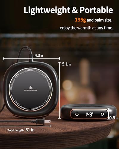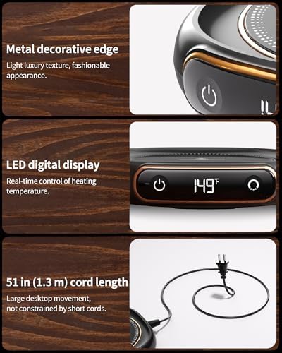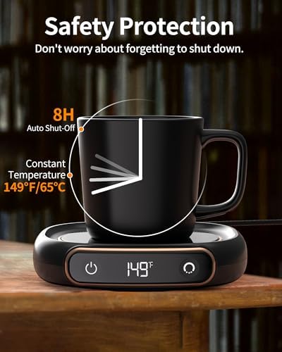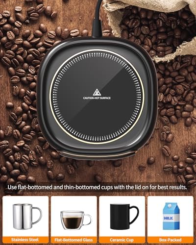 【CONSTANT 149°F Temperature】 Our Coffee Mug Warmer ensures that your beverages stay at a consistent 149°F, providing a perfectly warm sip every time. Whether you're keeping your coffee hot or warming up a cold drink, this mug warmer maintains your desired temperature throughout. Tip: For even faster warming and better heat retention, use the lid to cover your cup. 【3 ADJUSTABLE Temperature】 Choose from 113°F, 131°F, or 149°F with a simple tap to match your preferred warmth. Perfect for coffee, milk, chocolate, or tea. Best suited for flat/thin-bottomed stainless steel, ceramic, or glass cups. Also works as a candle warmer. Keeps your drink at the ideal temperature whether you’re working or relaxing. 【SAFETY & EFFICIENCY】 Mug warmer features an automatic shut-off function that activates after 8 hours of continuous use, ensuring peace of mind and safety. Its low-power design keeps your coffee or tea warm efficiently, making it ideal for long work sessions or extended relaxation periods. Additionally, the anti-slip bottom provides stable placement on various tabletops, enhancing overall safety 【PORTABLE and Easy to Clean】 Our coffee cup heater features a 1.3m (51-inch) power cord, weighs just 7 ounces, and is only 0.9 inches thick, making it easy to use anywhere. Constructed from durable ABS and aluminum alloy with an upgraded metal heating plate, it heats up quickly and is easy to clean. Additionally, it operates quietly, ensuring a peaceful environment. 【A Warmer GIFT】 With its classic design, this mug warmer combines style and functionality, making it a perfect gift for any occasion—Valentine's Day, Thanksgiving, Christmas, New Year, or other festivals. It keeps your coffee or tea warm efficiently, any hot drink enthusiast who loves having their beverage at the perfect temperature at all times.