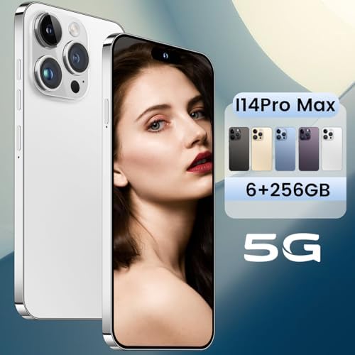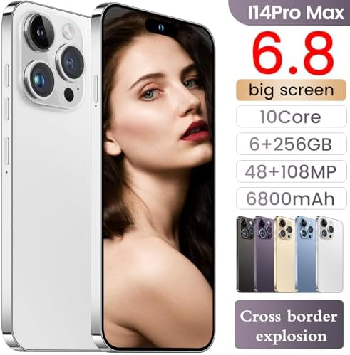 【6.8-inch HD Screen】6.8-inch HD Screen with 3040*1440 resolution 5G cell phones, deliver more vibrant colors and stronger contrasts. Magnesium aluminum body. Facial recognition, on-screen fingerprint unlock to protect your privacy. comfortable to hold. Adopts facial recognition and on-screen fingerprint unlocking to better protect your privacy. 【Android 13 & 6GB+256GB】Android 13 Phone is the lastest version, the excellent compatibility makes the smartphone 5G not obsolete in years. Powerful privacy controls protect you from malicious apps. This unlocked android smartphone has 6GB RAM makes the smartphone keep smooth when handling heavy tasks, running more apps in the background, 256GB ROM Supports expandable storage up to 128GB, Say goodbye to lag. 【108MP+48MP Camera & Deca-Core Processor】108MP main camera, paired with enhanced image processing algorithms, makes every photo exceptionally sharp and detailed, while still striking and lifelike. The cell phone is equipped with the powerful Deca-Core processor, which can dramatically improve the running speed, network, frame rate and picture smoothness, you will no more need to suffer from phone lag. 【6800mAH & 20W Fast Charging】Thanks to the 6800mAh powerhouse on the back, I14 Pro Max 5G keeps anxiety at bay with a bigger battery for offering you longer entertainment time. Moreover, it supports 20W fast charging to withstand urgent use - when it does need a charge, make it fast. 【Global Band & Dual SIM 5G/4G Phone】Support multiple bands dual card. unlocked phone will smoothly run multiple apps simultaneously with ease, meet your work and entertainment needs, such as T-Mobile, BTC, MetroPCS, H2O, Movistar, Telcel, Tigo, Claro, Vivacom, Ultra Mobile, and so on.