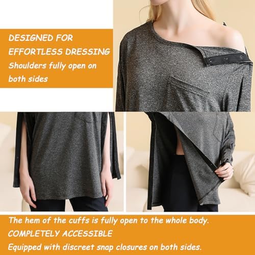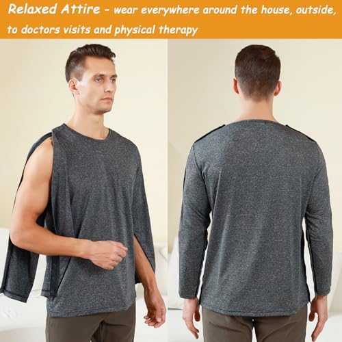SAVING TIME, EASY TO WEAR AND TAKE OFF. Post surgery shirt hospital patient clothing recovery top are designed with snaps on both sides, sleeves and shoulders. Broken arm shirt Hidden openings with easy snaps allow to go through many medical procedures without removing your clothes. Our patient care clothes elderly clothing disability protects the privacy of patients, facilitats various nursing operations, and facilitates early rehabilitation of patients. CLASSIC T STYLE - BEAUTY AND COMFORT: Post surgery shoulder recovery tshirt simple and fashionable, set off the masculine charm, stay away from normal mens hospital gowns for home care, tear away shirt avoid looking like a patient, stay gentleman, avoid exposure. Smooth wraps, corners and lining of adaptive clothing for men rehab shirt can avoid rubbing against the skin. Chemo clothing shoulder surgery rehab clothes avoids pressure points of shoulders. ADAPTIVE CLOTHING FOR SENIORS: shoulder surgery recovery, arthroscopic surgery, heart bypass surgery, spinal surgery recovery, rotator cuff surgery recovery, chemotherapy, post surgery recovery, physical therapy, doctor visits, sports injuries; the elderly, disabled, paralysis, bedridden patients, post-operative rehabilitation, incontinence person, handicapped, persons with limited mobility, fracture patients, patients with cancer, surgery recovery gifts. VERSATILE to wear around a sling, cast, bandage, IV or a site with a dressing (consider a larger size in case of obstructions); wear with all snaps closed or partially open as needed. Disability clothing: a perfect and thoughtful gift for anyone with limited mobility, after surgery, broken hand recovery. Our tearaway shirt clothes for after shoulder surgery are used in: hospitals, rehabilitation center, physiotherapy institutions, bedroom homes, nursing homes. BREATHABLE, soft fabric, ideal for post-surgery recovery. If our clothing for dialysis patients isn't suitable for you, please don't hesitate to contact us and benefit from our customer satisfaction and refund policy! Post shoulder surgery clothing patient shirt: Machine wash cold on gentle; Use non-chlorine bleach; Tumble dry low. Our chemo port access shirt have 4 sizes: Medium, Large, X-Large, XX-Large. #2,211,211 in Clothing, Shoes & Jewelry ( ) #31,818 in #50,499 in