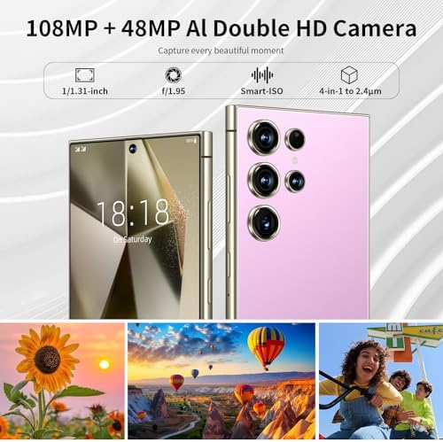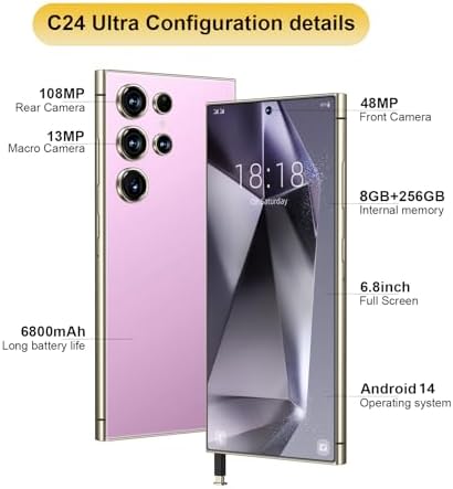 ?【Global Band, Dual SIM Dual Standby 5G Mobile Phone】 2 card slots, 2 SIM cards + TF cards can be inserted at the same time. Support Global network, this unlocked smartphones compatible with most major carriers in USA, Canada, Europe, etc ?【Up to 8GB RAM+256GB ROM】Equipped with a robust 10-core processor, 8GB RAM + 256GB ROM Memory, this unlocked Android phone ensures seamless multitasking and lightning-fast performance. Store all your favorite apps, photos, and videos without worrying about running out of space. Plus, expandable memory support lets you add more storage as needed. ?【Powerful Camera System】Capture life's moments with a remarkable 108MP rear camera and a 48MP front camera. Whether you’re snapping portraits or stunning landscapes, this unlocked smartphone delivers exceptional image quality. Elevate your photography game and enjoy crystal-clear selfies and vibrant photos, perfect for sharing on social media. ?【6800mAh Battery】 C24 Ultra unlocked phones equipped with powerful 6800mAh battery(Type-C charging port). This unlocked cell phone provide you with long battery life from early morning to late night for daily use. ?【Stunning Display & Android 14.0】Experience breathtaking visuals with our 7 inch HD unlocked Android phone featuring a 1440 x 3040 resolution and a 120Hz AMOLED display. The 2.5D curved glass design not only enhances durability but also provides an immersive viewing experience, making it perfect for streaming and gaming.