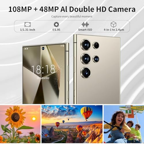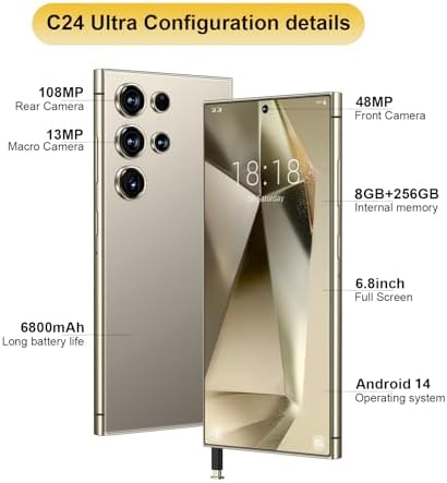 ?【Global Band, Dual SIM Dual Standby 5G Mobile Phone】 2 card slots, 2 SIM cards + TF cards can be inserted at the same time. Support Global network, this unlocked smartphones compatible with most major carriers in USA, Canada, Europe, etc ?【Up to 8GB RAM+256GB ROM】Equipped with a robust 10-core processor, 8GB RAM + 256GB ROM Memory, this unlocked Android phone ensures seamless multitasking and lightning-fast performance. Store all your favorite apps, photos, and videos without worrying about running out of space. Plus, expandable memory support lets you add more storage as needed. ?【Powerful Camera System】Capture life's moments with a remarkable 108MP rear camera and a 48MP front camera. Whether you’re snapping portraits or stunning landscapes, this unlocked smartphone delivers exceptional image quality. Elevate your photography game and enjoy crystal-clear selfies and vibrant photos, perfect for sharing on social media. ?【6800mAh Battery】 C24 Ultra unlocked phones equipped with powerful 6800mAh battery(Type-C charging port). This unlocked cell phone provide you with long battery life from early morning to late night for daily use. ?【Stunning Display & Android 14.0】Experience breathtaking visuals with our 7 inch HD unlocked Android phone featuring a 1440 x 3040 resolution and a 120Hz AMOLED display. The 2.5D curved glass design not only enhances durability but also provides an immersive viewing experience, making it perfect for streaming and gaming.