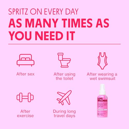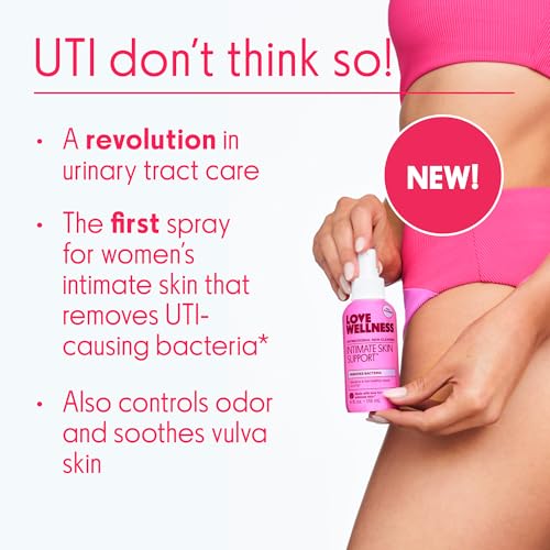 UTI PREVENTION SPRAY: Clinically proven Intimate Skin Support Spray with FDA-cleared hypochlorous acid to help prevent UTIs, odor, and irritation. Perfect for proactive urinary tract care and daily freshness. pH-BALANCED & GENTLE FOR DAILY USE: Designed to support vaginal health, this pH-balanced feminine spray is non-drying and safe for intimate skin. Free from alcohol, fragrances, dyes, and allergens, it offers a stress-free, soothing cleanse after bathroom use, workouts, or intimacy. ODOR & ITCH RELIEF WITHOUT HARSH CHEMICALS: Unlike traditional feminine hygiene products, this fragrance-free vaginal spray works by eliminating odor-causing bacteria, not masking it. Experience gentle yet effective itch relief and intimate skin cooling in an easy-to-use spray. NO RINSE REQUIRED – ON-the-GO CONVENIENCE: A no-rinse intimate cleanser for a quick refresh wherever you need it—post-sex, post-workout, after swimming, or while traveling. Keep one in your bathroom, bedside, or gym bag for worry-free freshness anytime. ACTUALLY EFFECTIVE FEMCARE: At Love Wellness, we're committed to using real science and safe ingredients to raise the bar for women's health products. Our doctor-developed solutions for vaginal, gut, and hormonal health support your total body health. This is femcare, our way. #4,867 in Health & Household ( ) #12 in